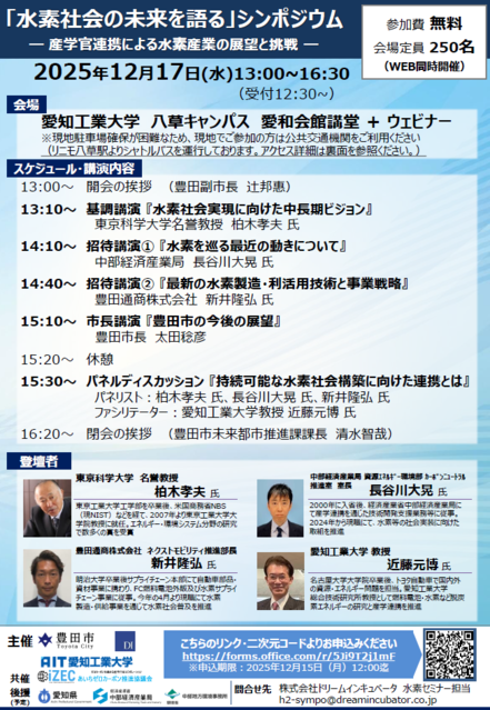 水素社会の実現に向けた最新の政策・技術動向を共有し、産業界・自治体・学術界など多様なステークホルダー間の情報交換とネットワーキングの場を提供することを目的とし、また、参加者間の議論を通じて連携体制の構築を促進し、地域における水素産業の健全な発展と、次世代人材の育成を支援するため、豊田市と愛知工業大学主催で本シンポジウムを開催いたします。多くの皆様のご参加をお待ちしております。