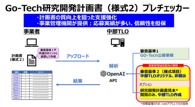 本ツールは、これまで事業管理機関として培ってきた知見と生成AIによる解析を組み合わせ、研究開発等計画書を 審査基準および様式項目の観点から多面的に分析・評価することで、応募前のセルフチェックやブラッシュアップを支援するものです。