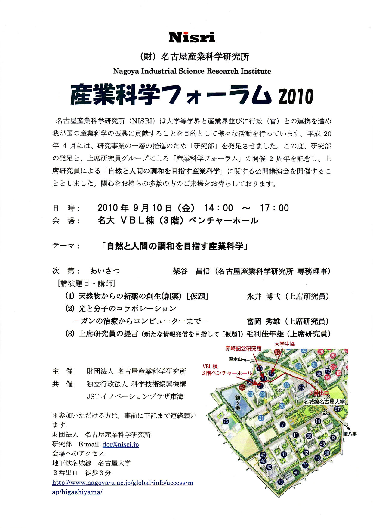 | 9月10日 | 産業科学フォーラム2010 テーマ 自然と人間の調和を目指す産業科学 講師・講演題目 永井博弌 天然物からの新薬の創生(創薬) 富岡秀雄 光と分子のコラボレーション ―ガンの治療からコンピューターまで― 毛利佳年雄 上席研究員の提言(国立大学法人の若手教員 1万人ポストの増設) |